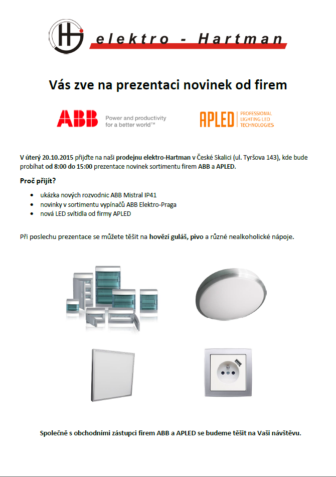 Pozvánka na prezentaci výrobků ABB a APLED dne 20.10.2015
