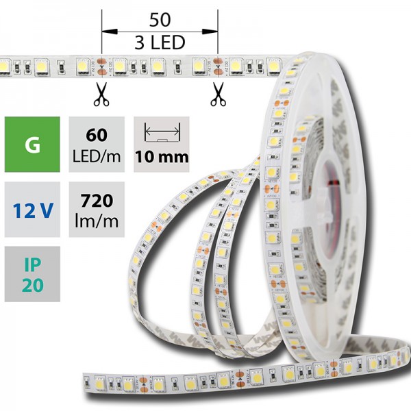 5050G-M60L10W20F12 LED pásek SMD5050, zelená (520 nm), 14,4W, 60LED, 720lm/m, segment 50mm, 3LED/segment, IP20, DC 12V, životnost 54000h, šíře 10mm, bílý PCB pásek, max. délka pásku při jednostranném zapojení: 5m, opatřen samolepící páskou 3M, UV stabilní. Balení 5m. Produkt je zařazen v následujících kategoriích